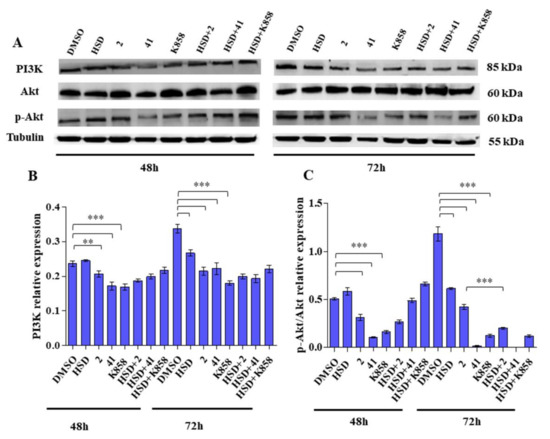 (A) PI3K and AKT expression levels in AGS cell line treated with HSD (180 μM), 2 (1 μM), 41 (5 μM), K858 (1 μM), and a combination of HSD with each Eg5 inhibitor for 48 and 72 h. DMSO 0.5%: control vehicle. Data are reported as mean ± SD of three independent experiments. Tubulin is used as a loading control. (B,C) The bar graph displays densitometric values expressed as mean ± SD normalized on loading control. *** p < 0.0001; ** p < 0.001.