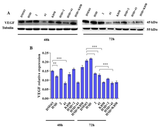 ELISA analysis of VEGF release within the culture medium reveals that 2, 41, and K858 reduce VEGF release with respect to the control (Figure 8A) after 48 and 72 h of treatment. Moreover, after 72 h of treatment, HSD significantly reduces VEGF release within the supernatant (Figure 8B).