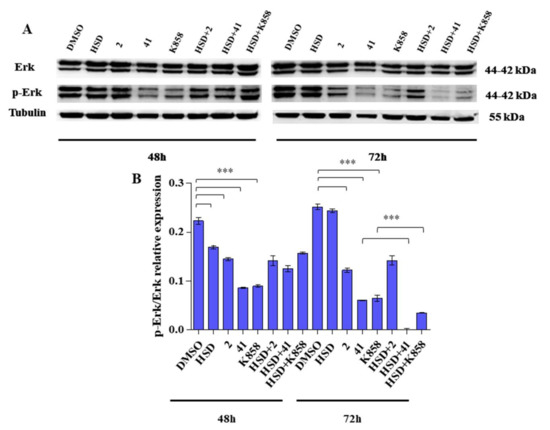 To identify the effects of 2, 41, and K858 on the activation of a specific MAPK, a Western blot analysis of Erk 1/2 was performed. After 48 and 72 h of treatment, all the tested Eg5 inhibitors determine a significant reduction in p-Erk/Erk ratio with respect to control. HSD is able to significantly reduce this ratio after 48 h of administration. In addition, after 72 h of treatment, HSD+41 and HSD+K858 combinations, significantly decrease p-Erk/Erk ratio with respect to 41 and K858 alone (Figure 9B).