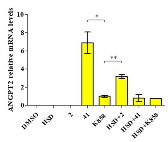 Relative gene expression of ANGPT2 in AGS cells treated with HSD (180 μM), 2 (1 μM), 41 (5 μM), K858 (1 μM), and a combination of HSD with each Eg5 inhibitor for 24 h. Data are expressed as relative to K858 as control (calibrator sample, defined as 1). Values represent means ± SD of three independent experiments. Y-axis, fold change. The most representative of three separate experiments is shown. ** p < 0.01; * p < 0.05.