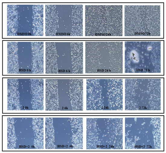 To evaluate the effect of 2 and HSD on AGS cell line migration, a wound-healing assay after 0, 6, 24, and 72 h, was performed. The cell monolayer scrape after 0 h of treatment is assumed as our starting point. After 6 h of treatment, there is a significant reduction of the cut width in AGS treated with HSD+2 if compared with DMSO (DMSO = 14.91%; HSD = 7.88%; 2 = 8.11%; HSD+2 = 5.18%). After 24 h of treatment, untreated AGS cells disclose a cut almost completely filled, with a width reduction of 72.98%, indicating that the AGS cell line has strong migratory potential, and this is significantly reduced with respect to all other experimental points (HSD = 29.42%; 2 = 48%; HSD+2 = 27.28%). Moreover, cells treated with 2 reveal a statistically significant decrease in cut width compared to cells exposed to the combination HSD+2. A parallel trend is recorded after 72 h of treatment (DMSO = 69%; HSD = 32%; 2 = 44.91%; HSD+2 = 25%) (Figure 11 and Figure 12).
