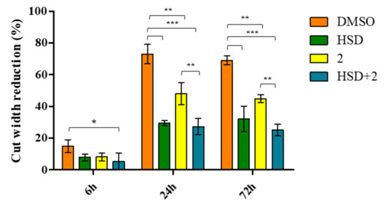 The bar graph displays the cut width reduction % obtained from scratch wound-healing assay in AGS treated with HSD (180 μM), 2 (1 μM), and HSD+2 after 6, 24 and 72 h. DMSO 0.5%: control vehicle. *** p < 0.0001; ** p < 0.001; * p ≤ 0.05.