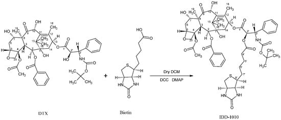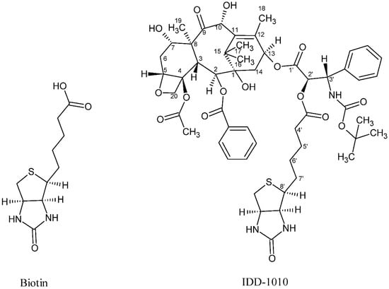 In this work, a novel conjugate of DTX and biotin was designed and successfully prepared to form a new DTX ester. In the conjugate, termed IDD-1010, the biotin is covalently linked to DTX at the carbon atom at position 2’, via an ester bond. The chemical structures of biotin and IDD-1010 are depicted in Figure 2.