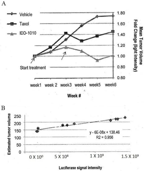 The estimated tumor volume at the start of drug injection was about 200 mm3. The data are presented in Figure 5. As can be seen there, the relative luciferase activity values show that IDD-1010 was more potent than Taxol and was the only treatment that led to a decrease in tumor volume.