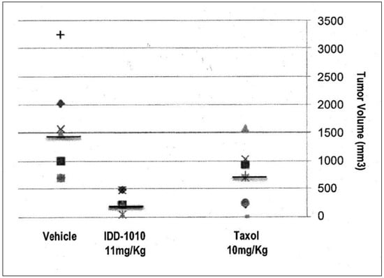 Prostate tumor (PC3-Luc) volume following treatment with IDD-1010, Taxol, and vehicle. By the end of the experiment, the tumor volume in each treatment group was determined by measuring the short and the long dimensions of the tumor and calculating volume according to the following equation: Volume = [(the shortest diameter)2 × (the longest diameter)]/2. The black lines represent median values.