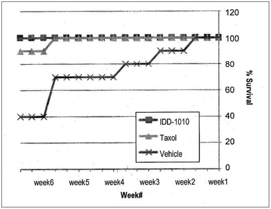 Weight loss in the mice resulted mainly from either drug toxicity or the growth of tumors to a size that exceeded the capability of the body to cope with. To test the effect of IDD-1010 on their weight, the surviving animals were weighed every week and at the end of the experiment. The recorded data are presented in Figure 4, which shows that IDD-1010 treatment did not lead to any significant weight loss; the p-value, in comparison to the vehicle group’s, was 0.1837. The average weight of the vehicle group was 27 g.