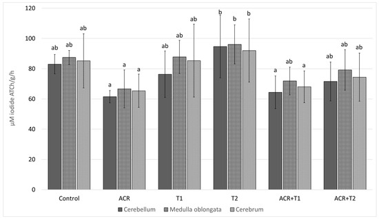 The AChE activity in the cerebellum, medulla oblongata and cerebrum of the control was (mean ± SD) 83.0 ± 6.37; 87.4 ± 4.70 and 85.2 ± 17.88 [μM iodide ATCh/g/h], respectively; Figure 1. In comparison to the control, ACR decreased in the particular brain areas by 25.9 (p = 0.154); 23.7% (p = 0.225) and 23.3% (p = 0.183). Concomitant ACR administration with T1 or T2 did not prevent this decline.
