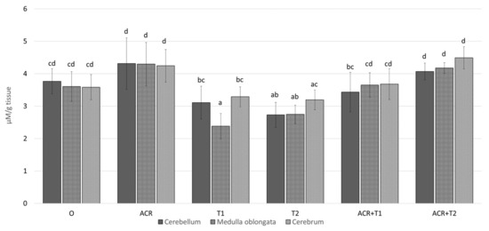 The GSH concentration in the cerebellum, medulla oblongata and cerebrum of the control was (mean ± SD) 3.6 ± 0.99; 3.1 ± 0.58 and 3.1 ± 0.55 [μM/g protein], respectively Figure 3 and was significantly decreased by ACR—both doses of α-tocopherol and combinations of their substances (p < 0.001). The higher dose of tocopherol (T2) decreased the concentration of this antioxidant the most strongly. In comparison to the control and ACR, its value was lower 4,3- (p < 0.001) and 2,3-fold (p = 0.02) in the cerebellum; 3,4- (p < 0.001) and 2,0-fold (p = 0.057) in the medulla, and 4,4- (p < 0.001) 1,9-fold (p = 0.231) in the cerebrum, respectively. Concomitant ACR administration with T1 or T2 did not prevent this decline.