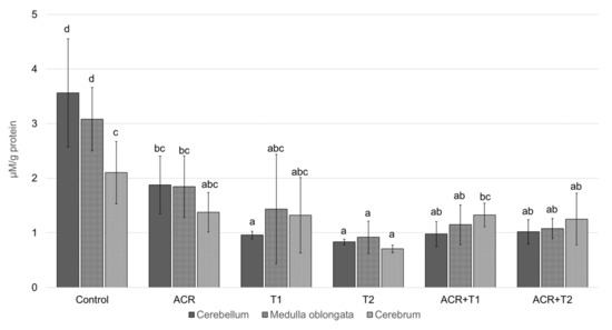 The MDA concentration in the cerebellum, medulla oblongata and cerebrum of the control was (mean ± SD) 3.8 ± 0.39; 3.6 ± 0.46 and 3.6 ± 0.39 [μM/g tissue], respectively; Figure 2. In comparison to the control, ACR slightly increased in the particular brain areas by 14.5 (p = 0.258); 19.2% (p = 0.073) and 18.4% (p = 0.159). On the other hand, the MDA concentration in T1 and T2 was lower by 1.2- (p <0.099) and 1.4-fold (p = 0.001) in the cerebellum; 1.5- (p < 0.001) and 1.3-fold (p = 0.008) in the medulla, and 1.1- (p < 0.667) and 1.1-fold (p = 0.888) in the cerebrum, respectively. Concomitant ACR administration with T1 or T2 raised this parameter in both brain areas to or slightly above level of the control.