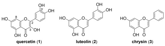 Flavonoids are a large class of natural polyphenolic secondary metabolites that are a common component of the human diet. Flavonoids generally have low toxicity and possess numerous beneficial biological activities such as antioxidant, anti-inflammatory, hepatoprotective, and anticarcinogenic properties [1]. Quercetin (1; 3,3′,4′,5,7-pentahydroxyflavone) is a bioactive flavonol found as a plant pigment mainly in onions, apples, and citrus fruits. It is used as a dietary supplement because it reduces oxidative stress, inhibits low-density lipoprotein oxidation and platelet aggregation, and acts as a vasodilator in blood vessels [2]. Luteolin (2; 3′,4′,5,7-tetrahydroxyflavone) is a common flavone found in fruits, vegetables, and medicinal plants. Luteolin (2) is known for its anti-allergic and anti-cancer activity [3]. Another flavone, chrysin (3; 5,7-dihydroxyflavone), occurs naturally in many plants, honey, and propolis and exhibits antioxidant, anti-inflammatory, anticancer, and antiviral properties (Figure 1) [4].