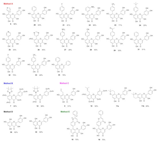 Procedures involving oxygen- or moisture-sensitive materials were performed with anhydrous solvents (vide infra) under a nitrogen atmosphere in flame-dried flasks, using standard Schlenk techniques. Analytical TLC was performed on Al plates (Silica Gel 60 F254; Merck, Prague, Czech Republic). Purification was performed using the preparative HPLC system (Shimadzu, Kyoto, Japan). Preparative HPLC separations were performed using an ASAHIPAK GS-310 20F column (5 mL/min. MeOH isocratic; Shodex, Munich, Germany). All analytical HPLC separations were performed with the Shimadzu Prominence System (Shimadzu, Kyoto, Japan). An ARION Polar C18 HPLC column (3 µm, 100 × 3 mm i.d.; Chromservis, Prague, Czech Republic) coupled an ARION guard column (5 × 4 mm, Chromservis, Prague, Czech Republic) was used. Mobile Phase A CH3CN/H2O/HCOOH (5:95:0.1), and Phase B CH3CN/H2O/HCOOH (80:20:0.1), were employed in the analyses. Mobile Phase A CH3CN/H2O/HCOOH (5:95:0.1), and Phase B CH3CN/HCOOH (100:0.1), were used for the analyses of protected flavonoids. The NMR analyses were carried out on spectrometers Bruker Avance IIITM HD 600 MHz equipped with a cryoprobe (1H 600 and 13C 151 MHz), Bruker Avance IIITM HD 500 MHz equipped with a cryoprobe (1H 500, 13C 126, and 19F 470 MHz), Bruker Avance IITM 500 MHz (1H 500 and 13C 126 MHz), and Bruker Avance IIITM 400 MHz (1H 400, 13C 100, and 19F 376 MHz) instrument (Bruker, Karlsruhe, Germany) in DMSO-d6, at 25 °C. The signal in DMSO-d6 was used as a reference (δH 2.499, δC 39.46).The 1H-NMR spectra and 13C-NMR spectra of the compounds 6, 20, 21, 22, 23, 24, 25, 26, 27, 28, 29, 7, 9, 10, 11, 30, 31, 32, 33, 12, 34, 35, 18, and 19 can be found in the Supplementary Materials (Figures S1–S52). Mass spectra were measured using LTQ Orbitrap XL hybrid mass spectrometer (Thermo Fisher Scientific, Waltham, MA, USA) equipped with an electrospray ion source and operated at the resolution of 100,000. The samples were loop injected into methanol/water (4:1), a flow rate of 100 µL/min. Reactions under microwave irradiation were carried out in microwave reactor Biotage Initiator + (Biotage, Uppsala, Sweden) using Biotage microwave reaction vials (borosilicate glass, 0.2–20 mL) equipped with aluminium cap and Teflon septa. Commercially available reagents and dried solvents were purchased from Sigma Aldrich (Darmstadt, Germany), Alfa Aesar (Ward Hill, MA, USA), Acros Organics (Morris Plains, NJ, USA), and TCI chemicals (Gurugram, India) and used without further purification unless otherwise stated. Infrared spectra were recorded on an FT-IR spectrometer Nicolet 6700 (Thermo Scientific, Waltham, MA, USA) using a standard MIR source, KBr beamsplitter, and DTGS detector, which was purged with nitrogen. For measurements, only transmission mode (64 scans, 2 cm–1 spectral resolution, Happ–Genzel apodization function) was used. The sample was dissolved in methanol, chloroform, or KBr pellet was prepared (diameter 4 mm). The FT-IR spectra of the compounds 6, 20, 21, 22, 23, 24, 25, 27, 28, 29, 7, 9, 30, 31, 32, 33, 12, 34, 18, and 19 can be found in the Supplementary Materials (Figures S53–S72).