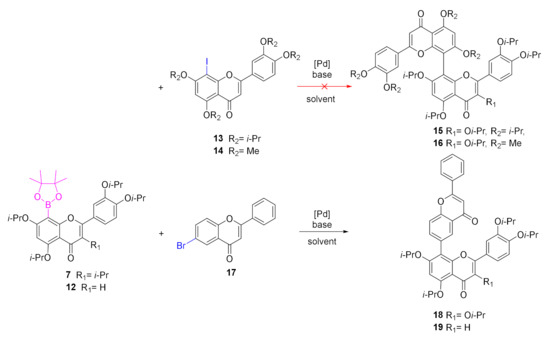 The preparation of biflavonoids by cross-coupling reaction between 8-iodo-3′,4′,5,7-tetra-O-isopropylluteolin (13) and 8-boronyl-3′,4′,3,5,7-penta-O-isopropylquercetin (7) failed under various reaction conditions. The products of these reactions were products of dehalogenation and deborylation of the starting materials. This reaction was also unsuccessful under other reaction conditions. The reactivity of boronate was studied to determine the effect of o-substitution. The reaction of 8-boronyl-3,3′,4′,5,7-penta-O-isopropylquercetin (7), and 6-bromoflavone (17) gave the product in 70% yield. This reaction proved that the low reactivity of iodo- and boronyl-flavonoids in the formation of biflavonoids is related to steric hindrance of the protecting group in the o-position and that the reaction proceeds when no substituent is present on the A-ring of the coupling partner. Pan et al. reported the synthesis of 8-(6″-umbelliferyl)-quercetin cross-coupling reaction of 8-iodo-3′,4′,3,5,7-penta-O-isopropylquercetin and 7-methoxy-6-boronylcoumarin in 73% yield, suggesting that the cross-coupling should work for substrates protected in the o-position [13]. To determine whether the reaction would also work with a sterically less demanding protecting group, cross-coupling of 8-boronyl-3,3′,4′,5,7-penta-O-isopropylquercetin (7) and 8-iodo-3′,4′,5,7-tetra-O-methylluteolin (14) was performed but was also unsuccessful. This reaction confirmed that the low reactivity of flavonoids in our experiments to form C-8-linked biflavonoids was related to the steric hindrance of protecting groups on the A-rings of coupling partners (Scheme 2).