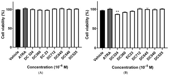 Neither ATRA nor any of the synthetic retinoic acid derivatives induced cytotoxicity at a concentration of 10−6 M (Figure 2A). DC324 exerted a small, but statistically significant decrease in cell viability compared to the vehicle control in 10−5 M, but it was still greater than the 70% relative survival that is required for the comet assay (Figure 2B).