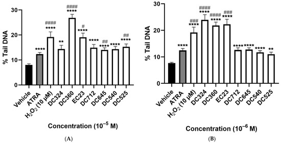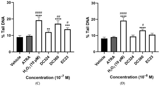 H2O2 (10−5 M) as a positive control significantly increased, by almost double he %tail DNA compared to the vehicle control. ATRA also significantly increased %tail DNA at 10−5 and 10−6 M but not at lower concentrations; the damaging effect was much less than H2O2. All tested concentrations of DC360 and the 10−6 M concentration of DC324 significantly increased %tail DNA compared to both vehicle control and ATRA at a similar extent to H2O2 (Figure 4A–D). We observed significant elevation of %tail DNA upon EC23 treatment at a concentration of 10−7–10−5 M compared to both control and ATRA (Figure 4A–C), but the 10−8 M concentration did not induce any alterations (Figure 4D). The highest concentration (10−5 M) of DC645 and DC525 significantly elevated %tail DNA compared to both vehicle control and ATRA, while DC712 and DC540 induced a significant increase only compared to vehicle (Figure 4A). At 10−6 M, these four compounds showed a significant increase compared to the vehicle control (Figure 4B).