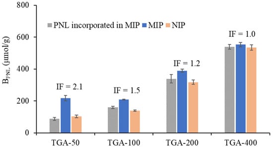 30], which is not the case for the TGA-MIPs. The amount of PNL bound was observed to be higher than the amount of PNL incorporated within the polymer matrix, which may be due to the presence of the oxygen atoms on the EGDMA that could also interact with PNL via hydrogen bonding.