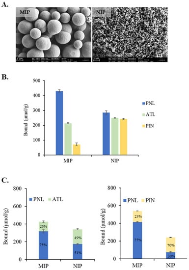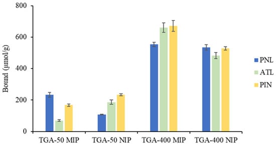 The TGA-400 NIP was observed to bind equivalent amounts of PNL, ATL, and PIN, and there was no preferential interaction with any of the compounds, which is characteristic of superficial binding events. The TGA-400 MIP also bound comparative amounts of ATL and PIN, higher than the PNL binding. This is consistent with earlier binding results (
