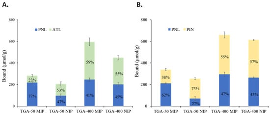 The template selectivity of the TGA-50 and TGA-400 MIPs was further assessed by competitive binding assays between the PNL template and an equimolar amount of either the ATL or PIN analogue. The results are shown in