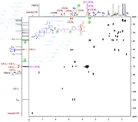 The structures of synthesized multivalent BA-CD conjugates 51–86 were characterized by NMR spectroscopy and MALDI-TOF mass spectrometry (Supplementary Materials). Except for the signals of the linker, the 1H and 13C NMR spectra of 51–68 are similar to each other; therefore, only the assignment of conjugate 64 is discussed in detail as an example. The 2D 1H-13C HSQC spectrum of conjugate 64 is shown in Figure 2, and inspection of it led to the assignment of most of the peaks. In the low-field region, the signal at δH 7.75 ppm (Supplementary Materials), according to the 1H-13C correlation spectrum, was assigned to triazolyl-CH. The proton of CONH at δH 6.13 ppm was easily identified, as there was no correlation in the 2D NMR spectrum. As a C7-symmetric macromolecular triazole adduct, conjugate 64 showed only one set of characteristic anomeric resonances [δH 5.49 ppm (β-CD-H1)]. Likewise, the other protons H2-6 of the β-CD scaffold were also assigned based on the HSQC spectrum. Two sets of peaks were clearly observed at 3.62–3.60 and 3.53–3.46 ppm (overlap with β-CD-H4 and NHCH2), which were assigned to the eleven OCH2 protons of the OEG group. Based on the literature data [36], major 1H NMR chemical shifts of the BA residue were attributed. For example, the occurrence of a vinyl residue was shown to be identified by very distinct signals at δH 4.72 and 4.57 ppm. Additionally, six methyl singlets were displayed at δH 1.67, 0.95, 0.94, 0.92, 0.80 and 0.74 ppm in the high-field region. The 13C NMR spectrum showed the expected number of signals (Supplementary Materials), which were assigned with the assistance of the HSQC spectrum. In the MALDI-TOF mass spectra (Supplementary Materials), a conjugate 64 molecular ion peak was observed at m/z 7228.56 (Calcd for C385H616N28NaO98+, 7228.25, Δ = 42.8 ppm), further confirming its identity as a fully substituted heptavalent conjugate.