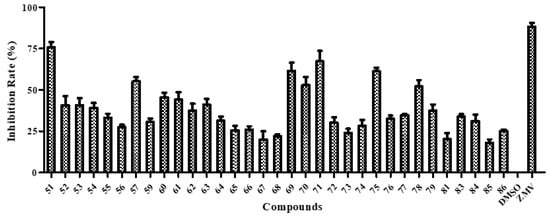 CPE-based screening of BA-CD conjugates 51–57, 59–79, 81 and 83–86 at a single concentration (20 µM). DMSO (1%) and zanamivir (ZMV, 5 μM) were used as negative and positive controls, respectively. Error bars indicate standard deviations of measurements of triplicate samples.