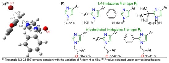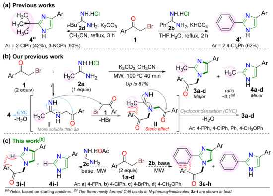 It is important to note that few studies have been reported to obtain imidazoles using aroylmethyl bromides 1 and amidines 2 [21,22] (Scheme 1a), specifically N-substituted derivatives that we even obtained by a pseudo-multicomponent reaction (pseudo-MCR) [24,26] (Scheme 1b). Likewise, there are few reports on imidazole derivatives synthesis based on pseudo-MCRs and MAOS. In a pseudo-MCR two or more components are identical, which could be a limitation regarding the scope and functional flexibility. However, these reactions have the advantage of being efficient in obtaining products with molecular complexity. In particular, we developed a pseudo-three-component synthesis of N-aroylmethylimidazoles 3a–d under microwave (MW) conditions in good yields by reacting two equivalents of 1 with acetamidine hydrochloride (2a) [24,25,26]. This reaction also allowed us to obtain the expected 1H-imidazoles 4 as minor products (Scheme 1b). Possibly, the better solubility in organic solvents and the major steric effect in the cyclization step from amidines 2b [21] and 2d [22] (Scheme 1a) vs. 2a [24,25,26] (Scheme 1b) direct the reaction course.