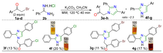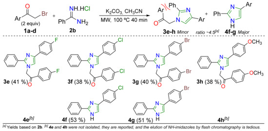 Considering our previous work on the MW-assisted synthesis of N-aroylmethyl-2-methylimidazoles 3a–d by a pseudo-MCR [24,25,26], we planned to study a similar protocol using the amidines 2b–c instead of 2a. This investigation was carried out to determine the steric effect influence of amidine salts 2a–c on the N-aroylmethyl-4-arylimidazoles 3a–l synthesis. The study began with the reaction between 2 equivalents of the respective α-bromoketone 1a–d with one equivalent of benzamidine 2b. Gratifyingly, the desired N-aroylmethyl-4-aryl-2-phenylimidazoles 3e–h together with 4(5)-aryl-2-phenyl-1H-imidazoles 4f–g were obtained in good yields in an estimated 4:5 ratio (Scheme 2). Products were purified by flash chromatography on silica gel; the first eluted fraction (eluent: DCM) had the new compounds 3e–h, while the second fraction (very slow, with a gradual MeOH increase up to DCM/MeOH 20:1 v/v) had the 1H-imidazoles 4a–g (major product).