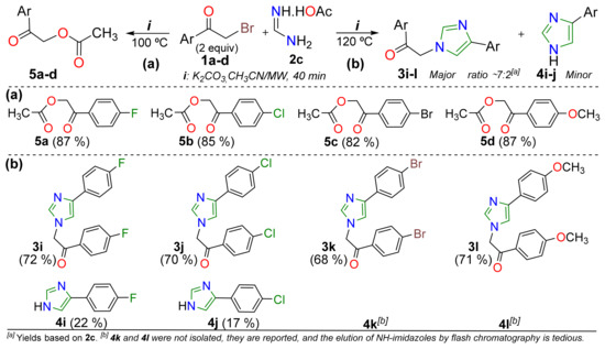 Synthesis of (a) aroylmethyl acetates 5a–d and (b) imidazoles 3i–l and 4i–j.
