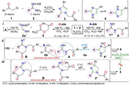 Regarding the imidazoles’ synthesis 3 and 4 via the reaction of aroylmethyl bromide 1 with amidines 2, a plausible and general mechanism in Scheme 4 is depicted [24]. The N-substituted imidazoles 3a–l are formed by a regioselective pseudo-MCR of three steps (di-N-alkylation i/iib, cyclocondensation iii), while 1H-imidazoles 4 are obtained through a two-step process (N-alkylation i, cyclocondensation iia). It starts with a nucleophilic attack of the amidine 2 on substrate 1 (or the ketoester 5 in situ generated) to form the intermediate A, which can undergo a cyclocondensation reaction via the alcohol 4* to afford products 4 or a second N-alkylation with 1 (or 5) giving the cyclization intermediate B. This intermediate can then involve a cyclocondensation by attacking its nucleophilic nitrogen atom on a carbonyl group, with the later loss of a water molecule from 4*. It is important to emphasize that due to steric factors, the N-alkylation of A (intermolecular) or cyclocondensation of B (intramolecular) may be disadvantaged (Scheme 4).