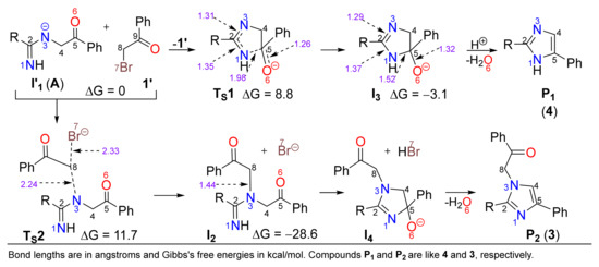 We considered a model system including the phenacyl bromide (1’) and the anion I’1 (A in Scheme 4). We determined that the initial reactive species is I’1, deriving from the deprotonation of intermediate I1 using the CO32− present in the reaction medium. This anion has a negative and nucleophilic nitrogen atom (N3). The deprotonation at sp2 nitrogen atom (N1) was ruled out on energy grounds (Scheme S1). The key step of the mechanism is the competence between the intramolecular cyclocondensation reaction (path 1: I’1 → TS1 → I3, route iia in Scheme 5) and the N-alkylation reaction (path 2: I’1 → TS2 → I2, route iib in Scheme 4), which eventually lead to 4-aryl-1H-imidazoles P1 or N-substituted 4-aryl-1H-imidazoles P2 (compounds 4 or 3 in Scheme 4), respectively (Scheme 6 and Figure 2).