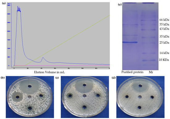 (a) Purification of corresponding (0–30%) active antibacterial fraction by ion exchange chromatography (linear gradient from c88150 mM to 1 M NaCl). (b–d) Antibacterial activity of bound fraction vs. Vibrio cholerae, Staphylococcus aureus and Eshersia coli, respectively. Top well—100 µg of Ampicilin (Control), Centre well—100 µg of unbound fraction, Right well—25 µg of bound fraction, Bottom well—50 µg of bound fraction, Left well—100 µg of bound fraction. (e) Purified Solanum trilobatum antibacterial protein (left lane) on 15% Poly acrylamide gel electrophoresis with standard marker (right lane).