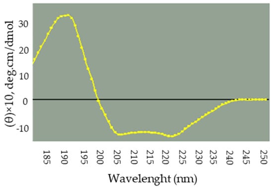 The CD measurements of the purified protein were carried out using Jasco J 815 polarimeter. The instrument was calibrated with a standard solution of (+)-10-camphorsulfonic acid. The measurements were recorded with 0.1 mg/mL of purified antibacterial protein in wavelength range of 190–240 nm at 25 °C at a resolution of 1 nm using Quartz cuvettes of 0.1 cm path length (Hellma, New York, NY, USA). Data were collected as triplets and the average spectrum has been taken for processing after baseline correction with the buffer spectrum. K2D2 software (Estimation of protein secondary structure from CD spectra. Avalilable online: http://cbdm-01.zdv.uni-mainz.de/~andrade/k2d2/, accessed on 18 December 2021) was used for data analysis. Mean Residue Ellipticity was calculated and utilized for secondary structure determination [43].