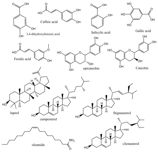 The chemical composition, including the main phytoconstituents of A. seyal (Figure 1), has been established and previously reported, and it can change with its geographical source, age of the trees, weather, and soil conditions [10,11]. Leaves, flowers, and pods of A. seyal contain reasonable amounts of phytochemicals, including proteins, saponins, phenolics, flavonoids, anthocyanins, and carbohydrates [12]. Although alkaloids and anthraquinones were not detected in the bark extract of the plant according to Suleiman & Brima 2021 [13]. In other studies, the stem bark has been reported to contain flavonoids, saponins, terpenoids, steroids, alkaloids, phenols, coumarin, and tannins [14,15]. The phenolic acids “gallic acid, salicylic acid, p-coumaric acid, caffeic acid, 3,4 dihydroxy benzoic acid, and ferulic acid” were detected in A. seyal leaves [16,17,18]. The stem bark of A. seyal (Djibouti type) was reported to contain catechin, epicatechin, lupeol, campesterol, stigmasterol, clionasterol, and oleamide [19], whereas the complex of polysaccharides and calcium, magnesium, potassium salts, protein, gallic, ellagic, and chlorogenic acids were reported as phytoconstituents of A. seyal gum [20].