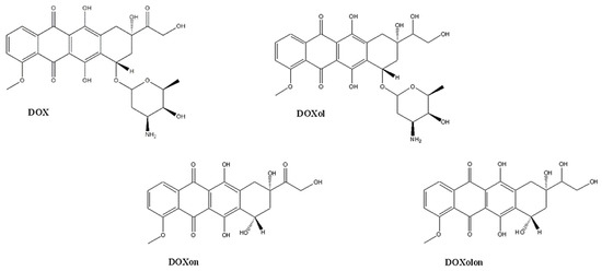 The treatment of malignant diseases poses many challenges that need to be overcome, due to their wide prevalence and high mortality rates [1]. Anthracyclines are a group of antitumor drugs that were isolated from the genus Streptomyces in the 1960s, and their main representatives are doxorubicin (DOX, depicted in Figure 1) and daunorubicin [2]. They are used in the treatment of numerous solid tumors and hematological malignancies, including leukemia, lymphoma, breast, and ovarian tumors [3,4]. Anthracyclines are generally subject to hepatic metabolism. DOX enters cells by free diffusion, and achieves its action in the nucleus and mitochondria. The three major DOX metabolites are produced in cells (Figure 1), i.e., doxorubicinol (DOXol), doxorubicinone (DOXon), and doxorubicinolone (DOXolone) [5]. According to the available data, almost 50% of unchanged DOX, 30% of DOXol, and 9% of the DOX aglycone, including DOXon, are excreted in the urine [6]. Animal studies have demonstrated that each of these metabolites is formed under NADPH-dependent conditions, suggesting the existence of specific enzymes involved in DOX metabolism [7,8]. For pharmacokinetic and pharmacodynamics studies, the determination of DOX, DOXol, and DOXon in urine, plasma, liver, spleen, and heart tissues is of clinical relevance [9,10]. The most significant role in the induction of cardiotoxicity has been ascribed to DOX and DOXol, but the exact mechanism of their toxic action has not been fully elucidated. DOXol is more hydrophilic than DOX and enters cardiomyocytes to a greater extent, causing more damage [6]. Furthermore, DOXone or DOX hydroxyaglycone is formed by hydrolysis of the glycosidic bond of DOX, while further carbonyl reduction of DOXon produces DOXolone. In the heart, the amount of DOXon is negligible, as it is almost immediately converted to DOXolone [7]. Even though significantly less DOXon is produced by metabolism compared to DOXol, measurable and clinically significant amounts of this metabolite are still found in urine.