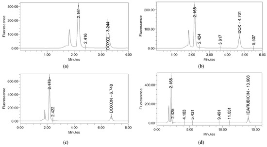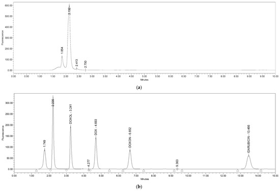 The figures show that every standard has different retention times, i.e., the chromatographic maximums do not overlap, confirming the specificity and selectivity of the method. The analyte retention times are 3.243 min for DOXol, 4.700 min for DOX, 6.639 min for DOXon, and 13.909 min for IDA. The deviation in retention time was negligible in repeated analyses in hexaplicate for all three analytes (ranging between ±0.001 min and ±0.002 min).