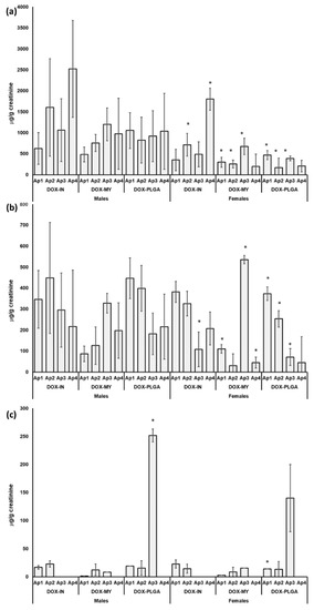 The concentrations of DOX and its metabolites found in the urine of male and female Wistar rats after treatment with DOX-IN, DOX-MY, and DOX-PLGA are presented in Figure 4.