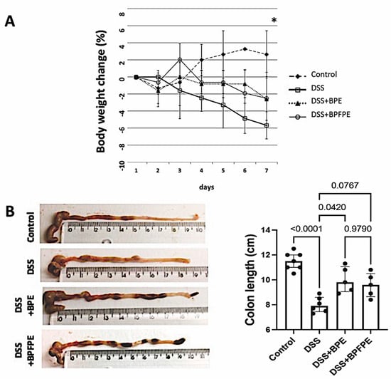 Effect of pretreatment with BPE and the BPFPE on the clinical and anatomical parameters of the colitis model. Following dextran sodium sulfate (DSS)-induction, animals presented a progressive weight loss compared with control animals on day 7 (* p = 0.007) (A). Colon length shortening following DSS-induction was significantly attenuated upon pretreatment with BPE and BPFPE (B). Values are medians with interquartile ranges of two independent experiments, with 2 to 4 animals per group. The analysis was performed by Brown–Forsythe and Welch analysis of variance (ANOVA) tests in which multiple comparisons were performed using the Dunnett’s T3 test. Significant values are presented.