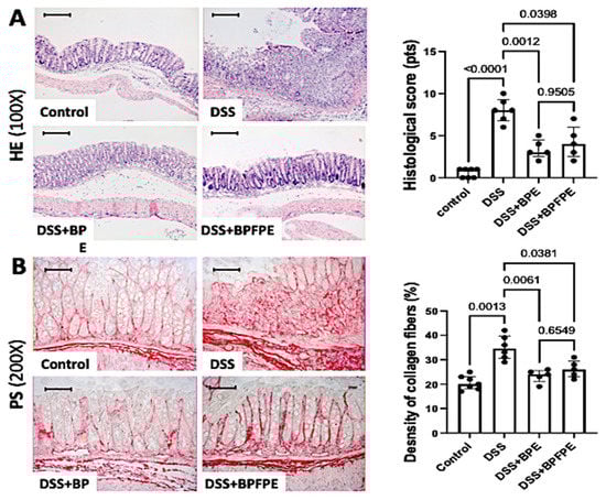Collagen deposition was significantly higher in the colons of mice subjected to DSS than in the colons of control mice. However, collagen deposition was significantly prevented in BPE- and BPFPE-pretreated mice compared with DSS-induced mice (Figure 2B).