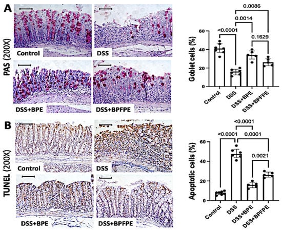 Effect of pretreatment with BPE and BPFPE on the density of goblet cells and on apoptotic rates within the colon. Paraffin sections are stained with periodic acid-Schiff (PAS), and, using the terminal deoxynucleotidyl transferase (TdT)-mediated dUTP nick-end labeling (TUNEL) assay for detecting apoptotic cells, were analyzed using a computerized image analysis system. Animals induced with DSS presented a remarkable loss of goblet cells (A) and a dramatic increase in apoptotic rates (B) in colon samples, significantly prevented by the administration of BPE and BPFPE. Values are medians with interquartile ranges of two independent experiments, with 2 to 4 animals per group. The scale bars represent 50 μm. The analysis was performed by Brown–Forsythe and Welch ANOVA tests in which multiple comparisons were performed using the Dunnett’s T3 test. Significant values are presented.