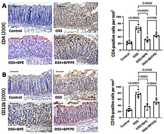 Next, we performed immunohistochemistry to label CD4- and CD11b-cells (Figure 4A) to further characterize the different inflammatory cell populations present in the lamina propria. Similar results were found for the CD4-positive and CD11b-positive cell populations. BPE- and BPFPE-pretreated mice accumulated fewer CD4- and CD11b-positive cells in the lamina propria compared with DSS-induced mice (Figure 4B).