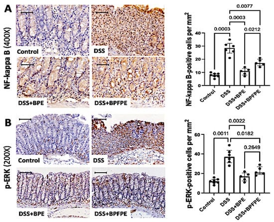 Effect of pretreatment with BPE and the BPFPE on the expression of intracellular signaling pathways involved in the inflammatory response triggered by DSS-induction. Paraffin sections stained with indirect immunoperoxidase were analyzed using a computerized image analysis system. Animals treated with BPE and BPFPE exhibited significantly less NF-κB (A) and fewer phosphorylated ERK-positive cells (B) compared with those of DSS-induced animals. Values are medians with interquartile ranges of two independent experiments, with 2 to 4 animals per group. The scale bars represent 50 μm. The analysis was performed by Brown–Forsythe and Welch ANOVA tests in which multiple comparisons were performed using the Dunnett’s T3 test. Significant values are presented.