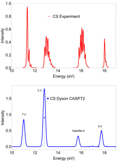 The CS molecule has been the subject of recent theoretical investigations [18,23,50] due to its well known strong satellite structures [30]. A recent EOM-CC study [23] has shown that the EOM-CCSD approach is able to deal with ionizations dominated by one-hole () configurations, but it fails to reproduce the satellites where two-holes/one-particle () configurations are dominant, for which EOM-CC3 provided good results. As already anticipated, a previous study [18] of CS limited to the CASSCF level of treatment on the computation of the Dyson orbitals and DFT continuum has been presented. In that case [18] only the ionization energies (IEs) were corrected with the state-specific NEVPT2 method, although the Dyson orbitals—obtained at the CASSCF level—were missing important correlation description on the bound states, which can affect to some extent the photoionization properties. In the present study, both IEs and Dyson amplitudes are corrected with the MS-CASPT2 method and the continuum is further extended to TD-DFT, providing a better description of correlation in the photoionization dynamical parameters. An additional intense satellite is also investigated.