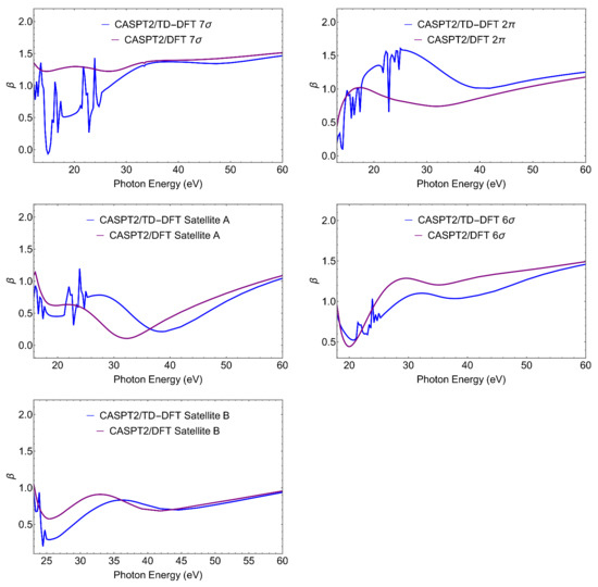 For what concerns the individual ionizations, one can note the much higher values at threshold for the outer valence ionizations and , and the very different slopes of the cross sections. Also, the difference between DFT and TD-DFT is significantly less for the outer ionizations than for the next two states, but is again reduced for the second satellite. All these features reflect the different composition, s versus p, C versus S, atomic orbitals, of the respective Dyson orbitals. While it is hardly possible to extract their contribution from the photoionization profiles, the cross-comparison of the results obtained from different calculated Dyson orbitals as well as from experiment, is a sensitive probe of their nature (i.e., of the AO composition of the Dyson orbitals). The difference between the profiles of satellites A and B is quite striking, and reflects the calculated parentage, close to for the first and to for the second. Still also the profiles of the first satellite and the state are significantly different. All these behaviors are also apparent in the parameter (Figure 3), which reflects interference among different partial waves in the continuum, and often highlights different aspects of the initial orbitals. We will not discuss this in detail, just notice again the rather different profiles of the first satellite and the ionization.