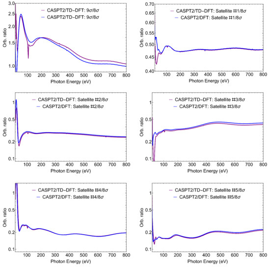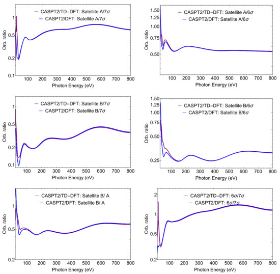 SiS. Orbital ratio, , at 30, 60, 400, 800 eV, and intensity ratio, . The CASPT2-Dyson/TD-DFT-continuum approach was used for , and CASPT2 for .