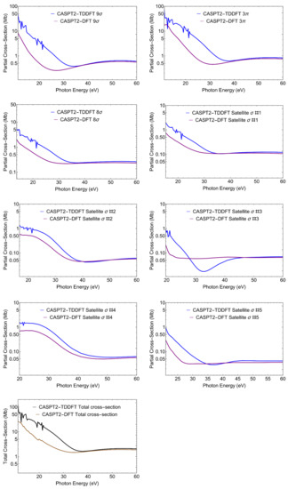 CS. CASPT2 Dyson/(TD-)DFT partial cross-sections (blue, TD-DFT and purple, DFT) relative to the ionic states considered. The last panel shows the total cross-section (black, TD-DFT and maroon, DFT).