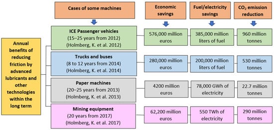 Annual global economic and energy savings, and CO2 emissions reduction by reducing friction in different industrial sectors [,,,].