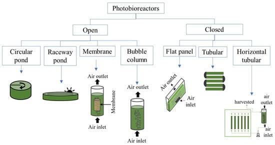 In microalgae cultivation is important to consider and control different variables, namely, light supply, photobioreactor type, dissolved oxygen concentration, culture media, etc., to optimize their growth and byproducts accumulation. Microalgae metabolism is versatile since they are able to grow under heterotrophic, autotrophic and mixotrophic conditions, as well as to tolerate a broad range of pH, salinity and temperatures [,,,], among other conditions. Large amounts of microalgae can be produced through various configurations of photobioreactors (either close or open), under different environmental conditions (outdoors or indoors) and light regimes (light/dark cycles). Figure 2 shows a classification of the most common photobioreactors according to their configuration. In close photobioreactors are usually made up of glass or plastic tubes which allow the control of water evaporation and minimize contamination risks. These photobioreactors can be placed under outdoors or indoors conditions depending on the product of interest. The surface/volume ratio of a closed photobioreactor is up to 80 m−1, which promote significant biomass concentrations []. The microalgae growth in closed photobioreactors is limited by accumulation of O2 and the proper supply of CO2. Therefore, it is necessary to determine the appropriate length of the tubes since it determines the residence and mixing times of the culture broth inside of the photobioreactor [,]. Mixing is necessary to homogenize the culture and distribute all the nutrients, as well as to avoid light limitation. In close systems, mixing is attained by air/CO2 supplying []. On the other hand, open systems can be natural lakes and ponds, artificial circular and raceway ponds, etc. []. Open ponds or high-rate algal ponds (HRAP) have been widely used for growing microalgae at full-scale due to higher technical and economic feasibility as compared to closed photobioreactor configurations []. The main variable in HRAP systems is the total area employed for their installation. They consist of a pond divided into two or four channels with depth in the range from 0.2 to 0.4 m, which promotes penetration of light inside the photobioreactor []. In contrast to closed systems, mixing in open systems is achieved by mechanical arms or paddle wheels. The CO2 supply is vital to promote growth of biomass and to foster O2 desorption, which may affect the productivity of the biomass and the product of interest [,]. Unfortunately, the risk of contamination by other microorganisms increases in open ponds due to exposure to environmental conditions, meanwhile significant water losses due to evaporation are generated.