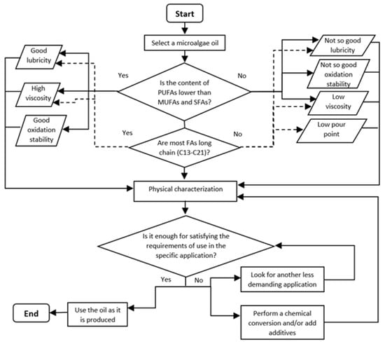 Overall, considering the above compilated information about the characteristics and production of microalgae oils and their possible optimization through chemical treatments, a general procedure is suggested to select suitable microalgae oils to produce biolubricants for different applications. The procedure is illustrated in the flow chart of Figure 6. The first step is to select a microalgae oil from a strain able to produce a significant amount of lipids containing a high concentration of FAs under feasible conditions. In addition, it must be considered that the selected microalgae strain has the required biomass productivity and growth conditions for full-scale production. Otherwise, the microalgae biomass production process must be conditioned, or another strain selected. Depending on the FAs type and concentration documented in the microalgae oil, the most important lubricant properties (lubricity, viscosity, pour point and oxidation stability) can be qualitatively predicted. These properties should be promising to meet the requirements of the desired specific application and then the oil must be fully characterized to determine the lubricant properties precisely. If the oil properties comply with the requirements for the target application, the oil can be used as biolubricant as it is produced. Should the application requirements be more demanding, the microalgae oil must be improved by chemical conversion and/or aggregating additives. In case modifications are not effective, other application should be sought for the biolubricant.