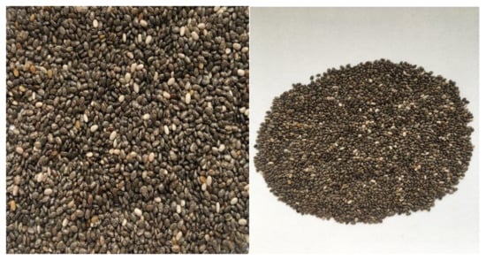 Salvia hispanica is an annual plant. It grows up to a height of 1 m. The leaves of this plant are elongated and serrated, arranged opposite, and measure 3–5 cm wide and 4–8 cm long. The flowers are bisexual, white or purple in color, arranged in whorls, have a labial structure typical of the Lamiaceae family, and a dimension of 3–4 mm. The seeds are oval in shape and measure 1–2 mm in length. They can appear uniform or as mixed and speckled (Figure 1) [7,8,9,34,47,48]. Their color can vary from white through gray to black. The white color of the seeds is a recessive trait, which is determined by a single gene and “exposed” by some chia growers. An example of the breeding variety with white seeds is S. hispanica cv. Salba. Agrisalba SA (Lima, Peru) declares that compared to darker chia seeds, white seeds have a higher and more stable content of omega-3 fatty acids, especially α-linolenic acid (ALA) [17,49].