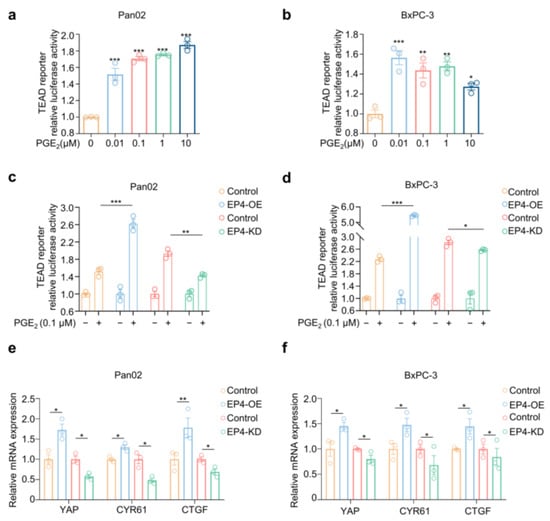 Aberrant activation of the Hippo–YAP pathway has been recognized in multiple types of human cancers, including pancreatic cancer. YAP overexpression predicts liver metastasis and poor prognosis of patients with pancreatic cancer []. We then examined whether PGE2–EP4 modulates the Hippo–YAP pathway in pancreatic cancer cells. We firstly observed that exposure of Pan02 and BxPC-3 cells to PGE2 significantly increased the level of intracellular YAP protein over time in Western blotting analysis (Figure S3a,b). YAP was the transcriptional co-activator for TEAD protein to activate downstream transcription [,,]. Thus, a TEAD-driven luciferase reporter was used to quantify YAP activation in pancreatic cancer cells. As shown in Figure 2a,b, PGE2 markedly promoted TEAD-driven luciferase activity in both Pan02 and BxPC-3 cells with a max luminescence fold increase of 1.87 (p < 0.0001) and 1.56 (p = 0.0027), respectively. In addition, the expression of YAP target genes CYR61 and CTGF [] was elevated upon PGE2 stimulation over time (Figure S3c,d). Together, these results demonstrate that PGE2 activates the Hippo–YAP pathway in pancreatic cancer cells.