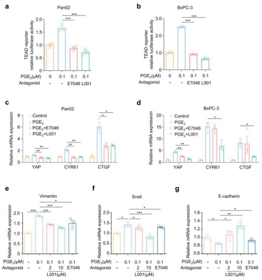 Epithelial–mesenchymal transition (EMT) enables cancer cells to perform dynamic changes to obtain strong mobilities and to shape into an enhanced aggressive metastatic phenotype by regulating EMT-associated markers []. Tumor cells tend to promote the expression levels of mesenchymal-related markers including Vimentin and Snail, as well as suppress the expression of epithelial-related genes including E-cadherin []. Previous research has argued that YAP could regulate the expression of EMT markers in pancreatic cancer cells []. Hence, we investigated whether EP4 antagonism would affect the expression of EMT markers. As expected, L001 remarkably abrogated the PGE2-aroused upregulation of mRNA levels of Vimentin and Snail, while it reversed the PGE2-mediated downregulation of E-cadherin’s expression, suggesting an impaired EMT capacity (Figure 5e–g). Together, these findings suggest that L001 is capable of impairing the PGE2–EP4-driven activation of the pro-metastatic Hippo–YAP pathway in pancreatic cancer cells.