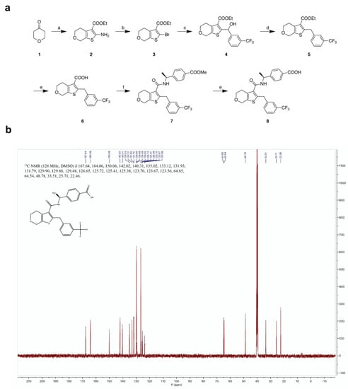 All chemicals were purchased from Adamasbeta Ltd., J&K Scientific Ltd., Sigma-Aldrich Inc., or Aladdin-Reagents Inc., and solvents were used as received from Tansoole or Sigma-Aldrich Inc. without further purification. All reactions were executed with standard procedures. The progress of each reaction was monitored by TLC on thin-layer plates. 1H NMR and 13C NMR spectra were generated on a Bruker 400 or 500 MHz instrument and obtained as DMSO-d6 solutions. NMR chemical shifts were reported in δ (ppm) using the δ 2.50 signal of DMSOd6 (1H NMR), and the δ 39.50 signal of DMSO-d6 (13C NMR) as the reference standards. The purity of all final compounds (≥95%) was established by analytical HPLC, which was carried out on an Agilent 1200 HPLC system with an ACE Excel 5 C18 column (5 μm, 4.6 × 250 mm), column temperature 40 °C, with detection at 254 or 280 nm on a variable wavelength detector G1314B. Compound 1 was reacted with elemental sulfur and ethyl cyanoacetate through Gewald reaction in ethanol solution to obtain 2, which then underwent bromination reaction to generate 3, and then underwent Barbier nucleophilic addition reaction with 3-(trifluoromethyl)benzaldehyde at −78 °C to generate the desired product, 4. Then, 4 reacted with excess triethylsilane and trifluoroacetic acid in dichloromethane to remove the hydroxyl group to obtain 5. Finally, compound 8 was obtained through hydrolysis and the HATU coupling reaction (Figure 8a). The 13C NMR of L001 was shown in Figure 8b.